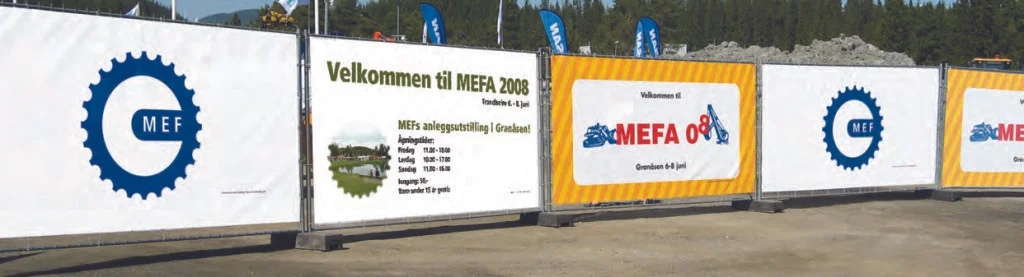 Tekstilbannere trykket i fotokvalitet og maljert for montasje på mobilrammer ( 2 x 3, 5m). Meget konkurransedyktig pris gjør dette til en god mulighet for profilering ifm messer, arrangementer og byggeprosjekter.